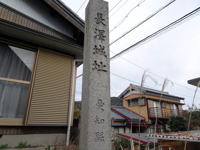 長沢御殿跡(長沢小学校)の北側は小高い住宅地ですが、ここにかつて長沢松平氏の長沢城がありました。現在は住宅地の民家の前に石碑が建っています。