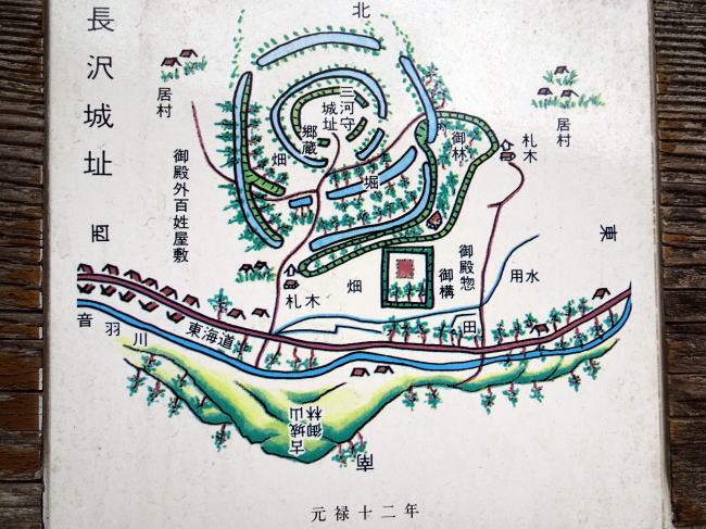 長沢御殿跡の案内看板にある元禄十二年の地図。これを見ると中央に長沢御殿がありますね。対して北側に三河守城跡とありますが、これは戦国時代の長沢城跡です。徳川将軍家の親戚である、長沢松平氏の居城でした。