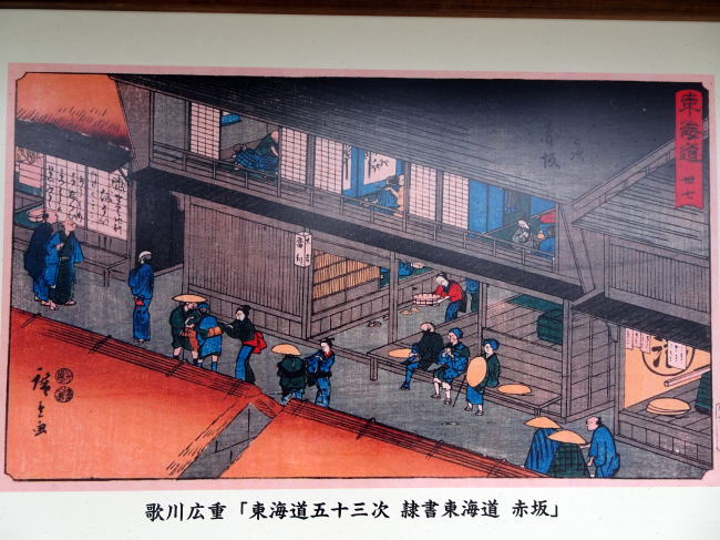現地案内看板にあった歌川広重 『東海道五十三次隷書 東海道赤坂』には、大きな旅籠と旅人の様子が描かれています。