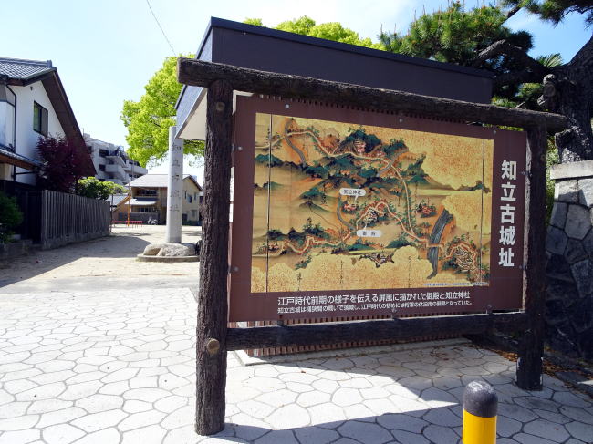 看板にある江戸時代前期の古地図。これをよく見てみると、御殿(知立古城跡)と知立神社の間の道が折れ曲がっていますよね?
