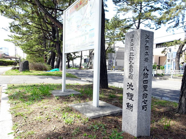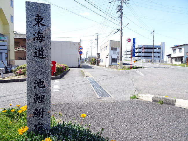 松並木を抜け、国道1号線を地下道で渡った先には、東海道池鯉鮒(知立)宿の石碑がありました。ここから宿場の中心地へと向かいます。