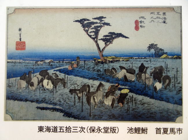 東海道名所図合によると、知立の馬市は旧暦の4月25日〜5月5日までの10日間開催されており、談合松という所で馬の値を決めていました。(写真中央)