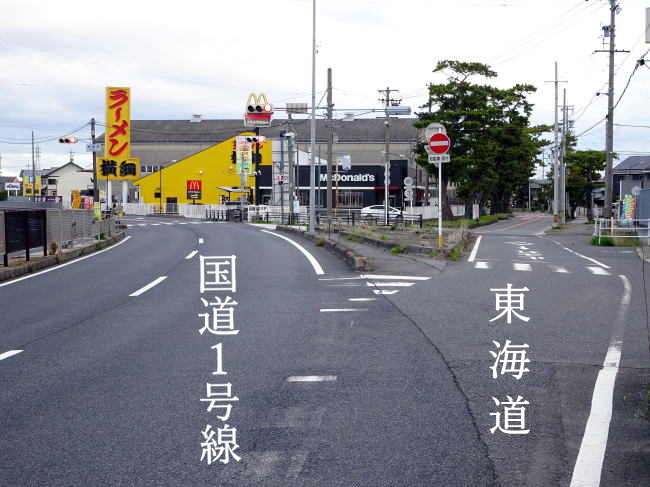しばらく国道1号線を歩いてきましたが、ラーメン横綱安城店とマクドナルドが見えてくる、尾崎東の信号から旧東海道と分かれます。