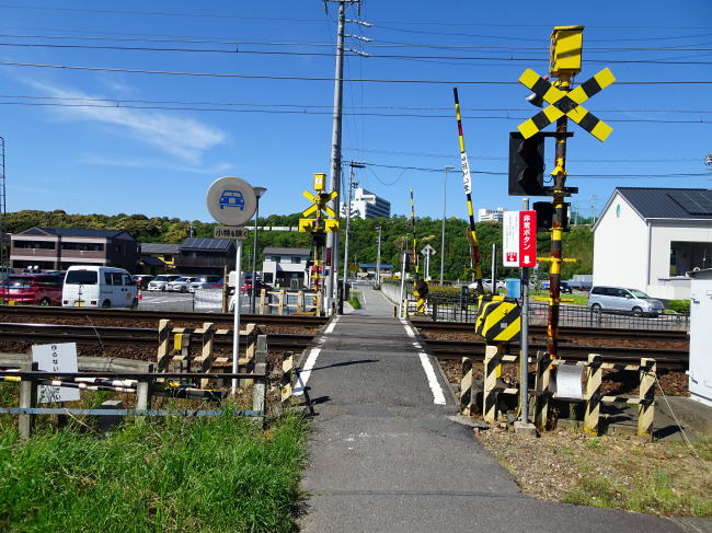 西棒鼻跡を過ぎたくらいの線路をよく見ると、反対側に渡ることができる踏切があります。