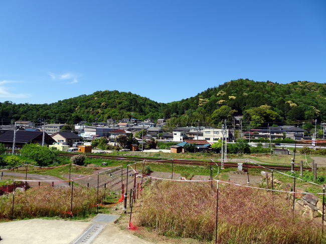本陣跡公園から北側を望む。名鉄線の向こうに住宅地がありますが、中世(戦国時代)の藤川宿は山網川の北、つまりあの住宅地がある場所にあったことが分かっています。
