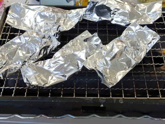 ガスコンロで焼く時、このアルミホイルのまま火の付いた金網の上に乗せるのです。