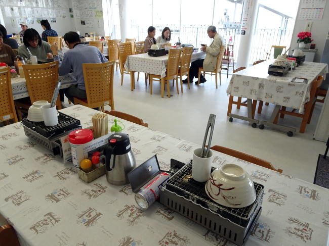 そして店内。いくつかのテーブル席がありますが、特徴的なのはどこも中央にガスコンロがあるという事。これはこのガスコンロで焼蛤を調理するということです。