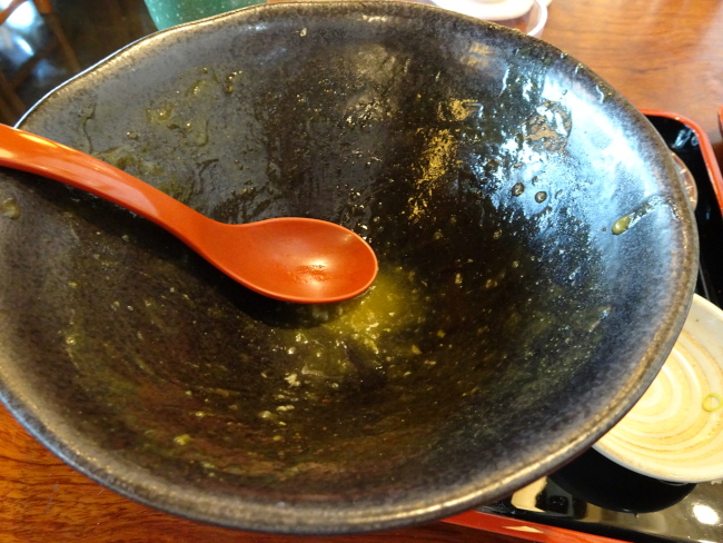 - 器の底から、ごはん・とろろ・カレーうどんの順に入れる