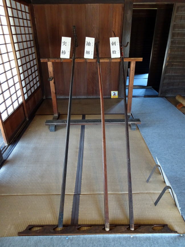 館内にある防具、突棒(つくぼう)、袖搦(そでがらみ)、刺股(さすまた)。取り調べに使います。