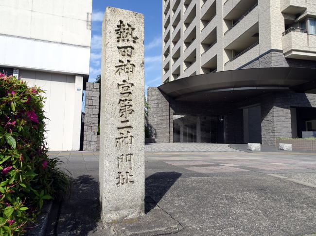 これはかつての熱田神宮の門があった場所だよ!という石碑で、逆に言うとここまで熱田神宮だったということです。