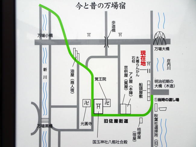 秋葉神社にある旧万場宿の看板。緑色が佐屋街道です。