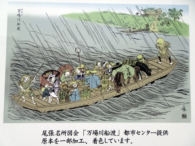 現地案内看板にある、尾張名所図会の万場川渡船。激しい雨の中を旅人たちを乗せた船が、万場川(現在の庄内川)を渡っています。